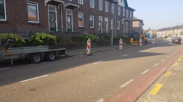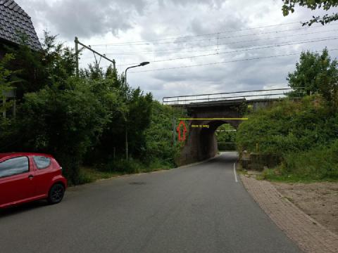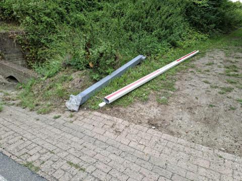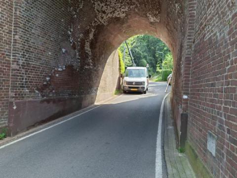 Geulle hoogte waaschuwings balk voor doorgang viaduct Slingerberg is eruit gereden door vrachtauto. Tot reparatie wordt door verkeersregelaars opgelet dat er geen vrachtauto doorkomt die te hoog is. Klik op eerste foto voor vergroting.